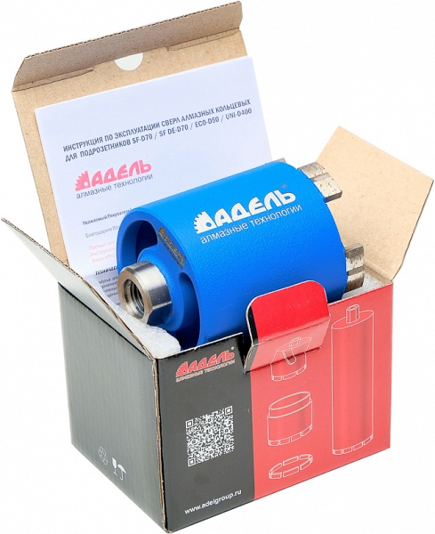 Алмазная коронка с пылеудалением для подрозетников по железобетону Адель Super Fast SF DE-D70 SDS-Plus 72/65 мм (Adel Супер Фаст СФ ДЕ-Д70 СДС-Плюс 72/65 мм) с адаптером М16 – SDS-Plus, центровочным твердосплавным сверлом и клином предназначена для скоростного сверления железобетона (армированного бетона), бетонных блоков, газобетона, кирпича и других строительных материалов с использованием ручного электроинструмента без охлаждения водой.