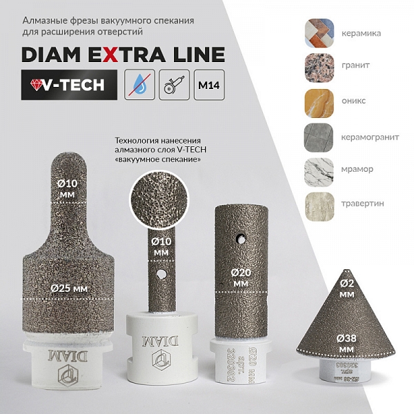Алмазная пальчиковая фреза Diam Extra Line V-Tech M14 20 мм (Диам Экстра Лайн В-Теч М14 20 мм) предназначена для расширения отверстий, а также возможности делать фаску для крепления в "потай" в керамике, граните, керамограните, мраморе, ониксе, травертине при помощи ушм (болгарок), перфораторов, дрелей без водяного охлаждения.