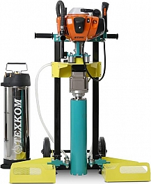 - Совеременный мощный двухтактный бензиновый двигатель Stihl 2,8 кВт (3,8 л.с.), надежный высококачественный цилиндрический планетарный редуктор, боковая промывочная муфта, механизм подъема и опускания алмазной коронки, узел подвода воды, безотказное центробежное сцепление, изготовленные из высококачественных материалов, а также квалифицированная сборка, делают керноотборники эффективными и долговечными инструментом для проведения сверлильных работ в тяжелых полевых условиях