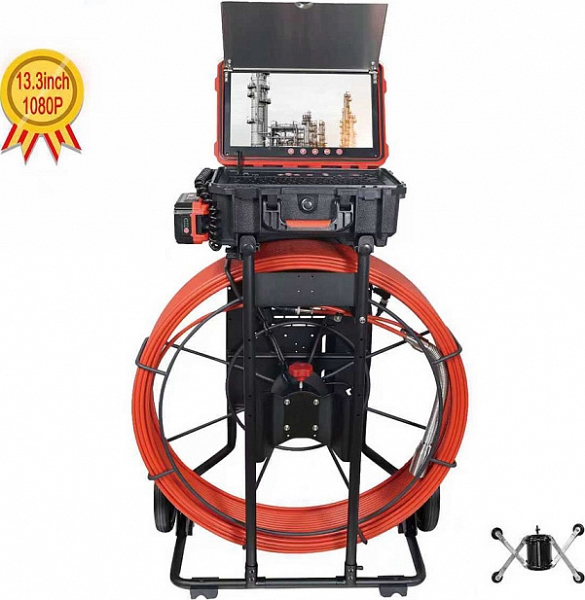 - Головка камеры Ø 39 × 77 мм и проталкиваемый кабель Ø 9 мм × 120 м из стекловолокна со счетчиком длины и системой торможения, подходящие для труб Ø 160 – 400 мм, длиной до 120 м