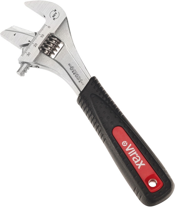 Разводной ключ с реверсом Virax 8" (Виракс 8") – высококачественный инструмент 2 в 1: насечки на одной стороне для закручивания и ослабления труб или поврежденных гаек, вторая сторона гладкая для обычных работ.
