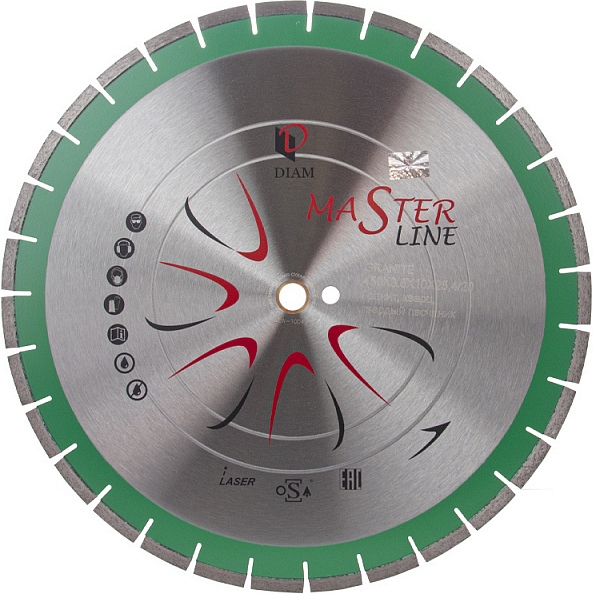 Сегментный алмазный круг Diam Master Line 1A1RSS Гранит 450 мм (Диам Мастер Лайн 1А1РСС Гранит 450 мм) – специальный сегментный алмазный отрезной диск для сухой и мокрой резки гранита, кварца, клинкера, твердых песчаников на камнерезных станках, стенорезных машинах, швонарезчиках и другом оборудовании, как с подачей, так и без подачи охлаждающей жидкости.