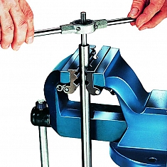 Тиски слесарные с наковальней и трубогибом Ridgid Peddinghaus Matador Multiplus 120 (Риджид Педдинхаус Матадор Мультиплюс 120) – профессиональные стальные слесарные тиски универсального назначения с наковальней и приспособлением для гибки труб и полос могут быть использованы как обычные тиски, как тиски для труб, а также для гибки труб (водопроводные и газовые трубы, трубы из нержавеющей стали) Ø 12, 15, 18, 22 мм. Дополнительно можно гнуть и выправлять металлические пластины толщиной до 6 мм. Отличаются наличием крепежных элементов под нижними губками тисков, для крепления различных видов защелкивающихся губок для работы с деревом, трубой, пластиком, нержавейкой и другими сложными элементами. Производятся в Германии более 100 лет и известны своим качеством и долговечностью.