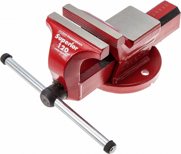 Тиски слесарные стальные поворотные с наковальней Ridgid Peddinghaus Superior 120 (Риджид Педдинхаус Супериор 120) – профессиональные комбинированные трубные и слесарные настольные верстачные тиски для монтажных работ. Отличаются наличием встроенных трубных тисков, расположенных под основными губками тисков, для работы с трубами Ø 3/8" – 3". Известны своим качеством и долговечностью. Производят в Германии уже свыше 100 лет.