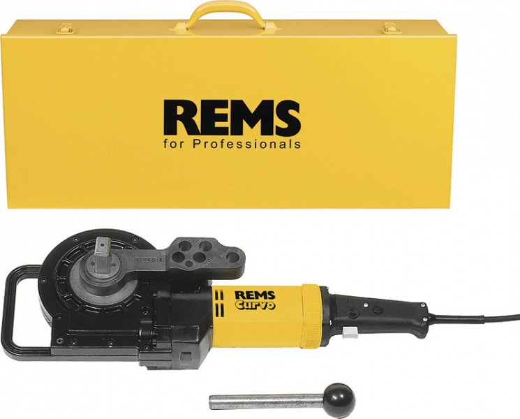 - Rems Курво Сет. Электрический трубогиб Ø 10 – 40 мм, 1/4" – 1 3/8", до 180°. Жесткие, полужесткие, гибкие медные трубы, в том числе тонкостенные, Ø 10 – 35 мм, 3/8" – 1 3/8", мягкие медные трубы в оболочке, в том числе тонкостенные, Ø 10 – 18 мм, толстостенные медные трубы K65 для холодильной техники и систем кондиционирования EN 12735-1 Ø 3/8" – 1 3/8", трубы систем запрессовки из нержавеющей стали Ø 12 – 28 мм, углеродистой стали, в том числе в оболочке, Ø 12 – 28 мм, мягкие трубы из прецизионной стали Ø 10 – 28 мм, стальные трубы EN 10255 Ø 1/4" – 3/4", электромонтажные трубы EN 50086 Ø 16 – 32 мм, композитные трубы Ø 14 – 40 мм и т. д. Электрический привод с не требующим технического обслуживания редуктором с проскальзывающей предохраняющей муфтой, универсальный двигатель 230 В, 50 – 60 Гц, 1000 Вт с бесступенчатым, электронным, толчковым выключателем, правый и левый ход, палец-упор. Сегменты и упоры для гибки. В прочном стальном чемодане.